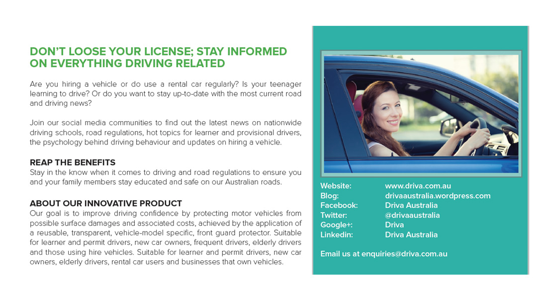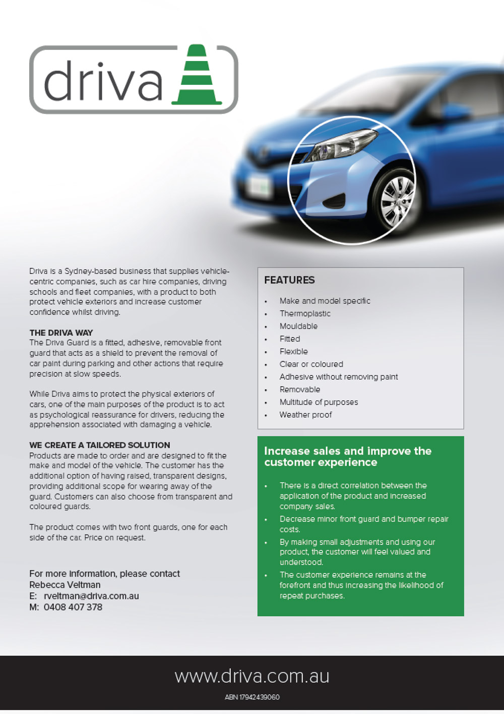A new product sheet was produced for Driva, detailing the new product. Flyers were also produced with a condensed version of the product offering.